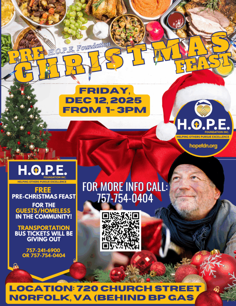 2025 H.O.P.E. Pre-Christmas Feast Volunteer Donate When: Friday, December 12, 2025 Time: 1:00 PM – 3:00 PM Where: 720 Church St., Norfolk, VA (location subject to change) Cost: FREE Celebrate Christmas with H.O.P.E. The H.O.P.E. Foundation invites you to our 2025 Pre-Christmas Feast, an event dedicated to serving our unhoused and at-risk guest This FREE […]