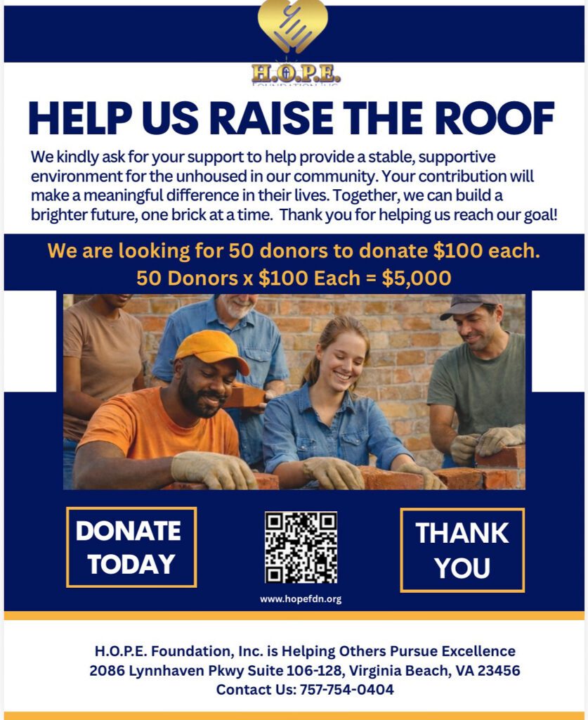 Right here in our Hampton Roads community, countless individuals are living without a roof over their heads—searching for safety, warmth, and a chance to rebuild their lives. We kindly ask for your support to help provide a stable, supportive environment for the unhoused in our community. The H.O.P.E. Foundation, Inc. is committed to changing that narrative, but we can’t do it alone.